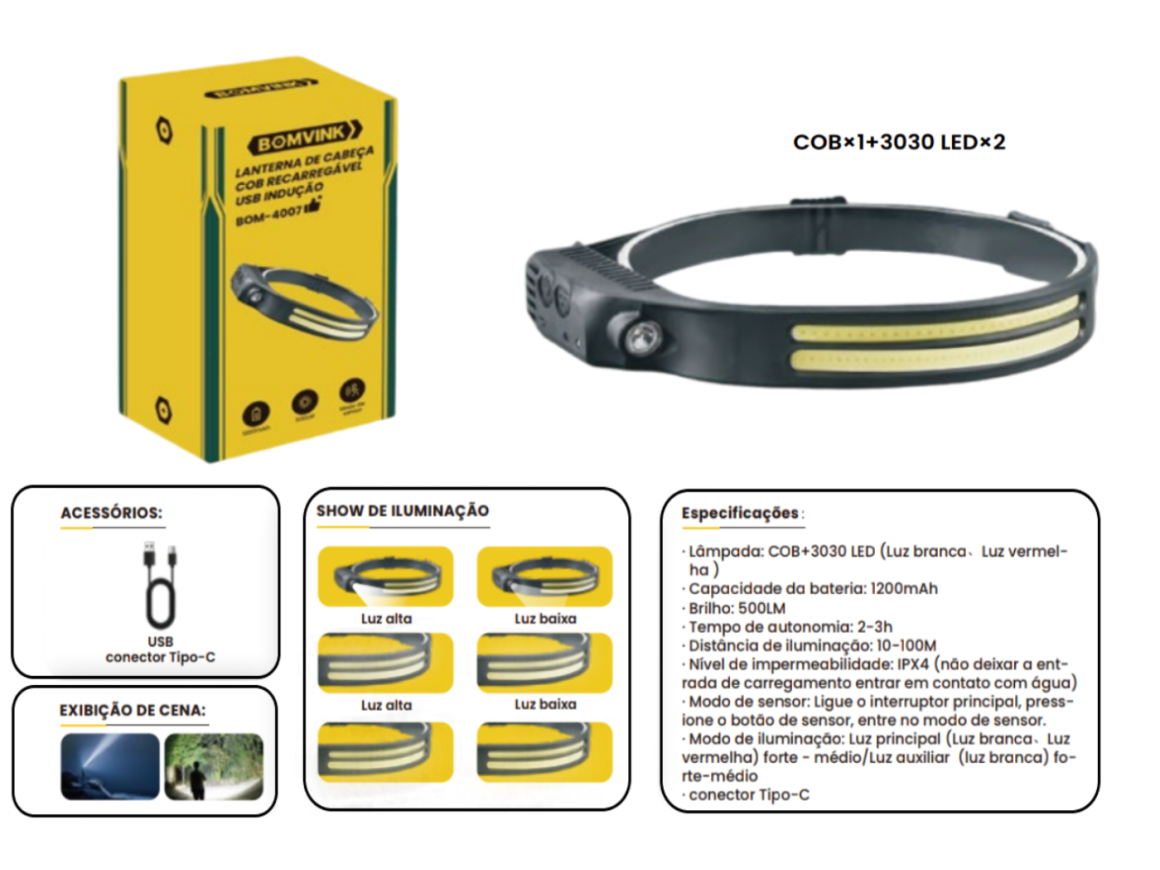 LANTERNA DE CABEÇA LED RECARREGAVEL USB BOM-4007
