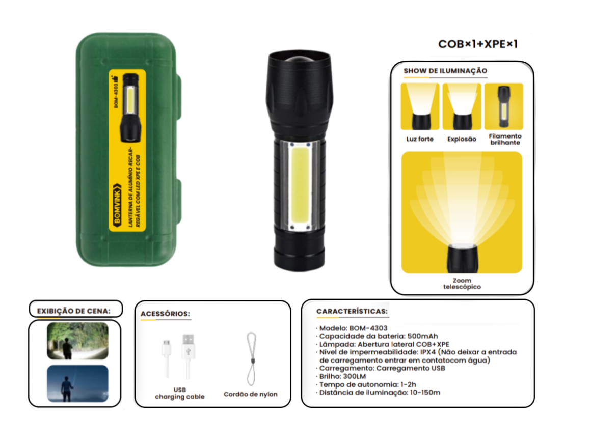 LANTERNA DE ALUMINIO RECARREGAVEL COM LED XPE E COB BOM-4303