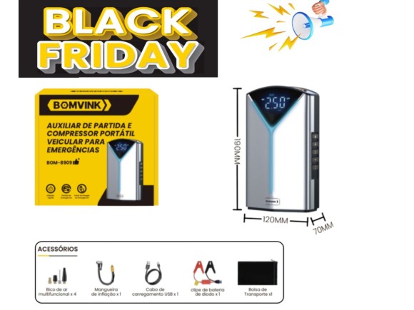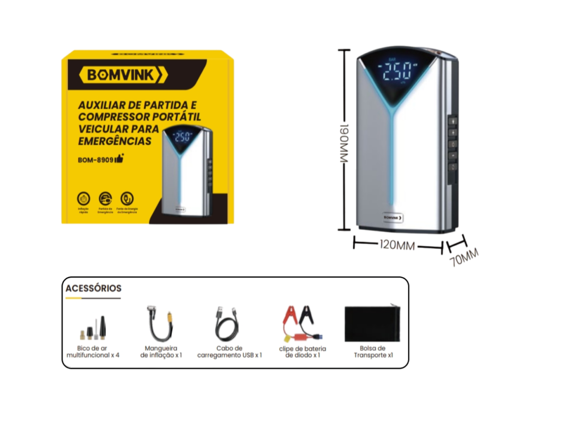 COMPRESSOR PORTATIL E AUXILIAR DE PARTIDA VEICULAR BOM-8909