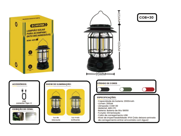 LAMPIÃO SOLAR PARA ACAMPAMENTO RECARREGÁVEL BOM-4211