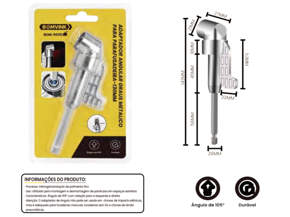 ADATADOR ANGULAR GRAUS METALICO PARA PARAFUSADEIRA 130MM BOM-5035