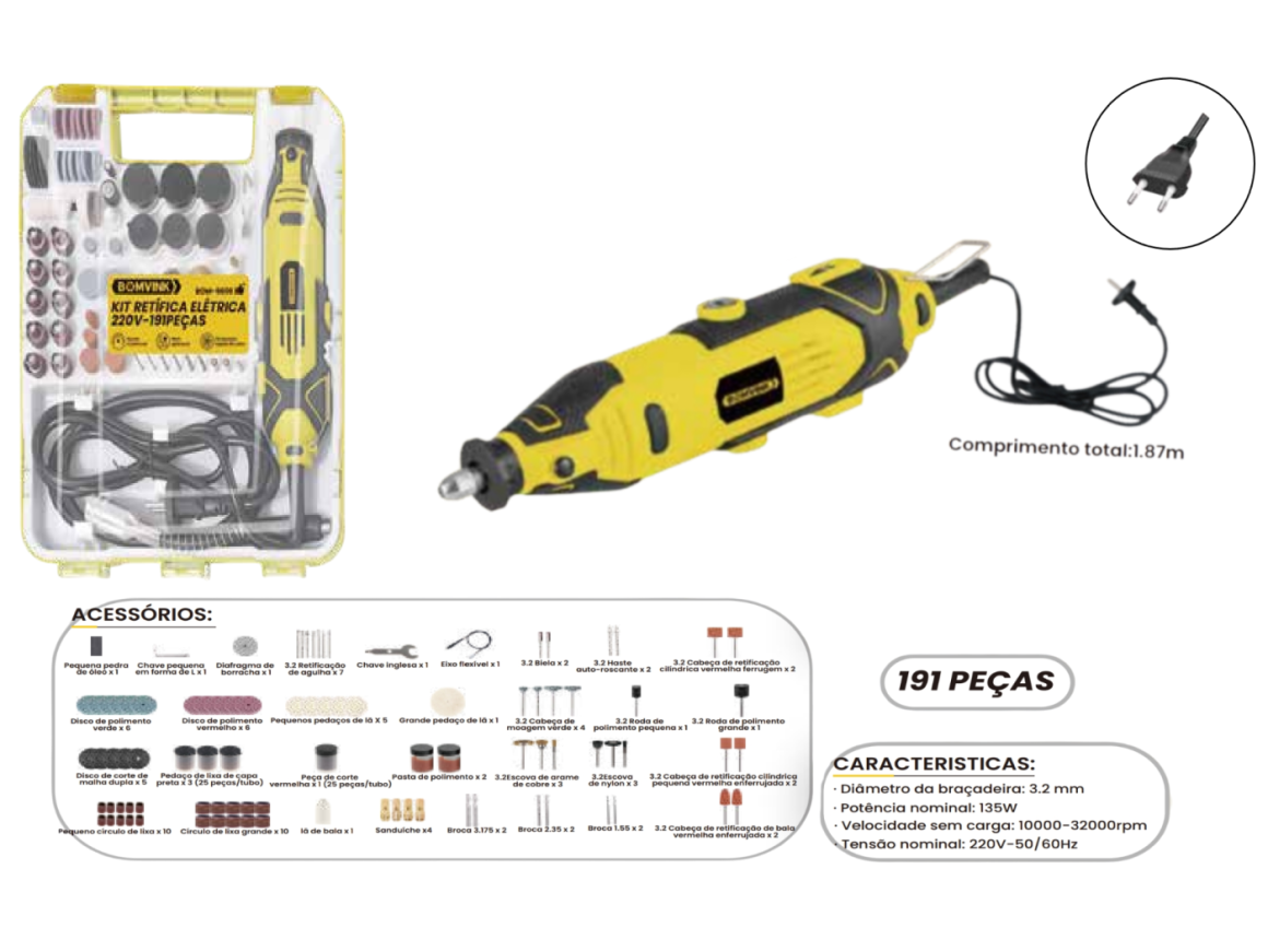 KIT MINI RETIFICA ELETRICA 110V 135W 191 PEÇAS BOM-9605