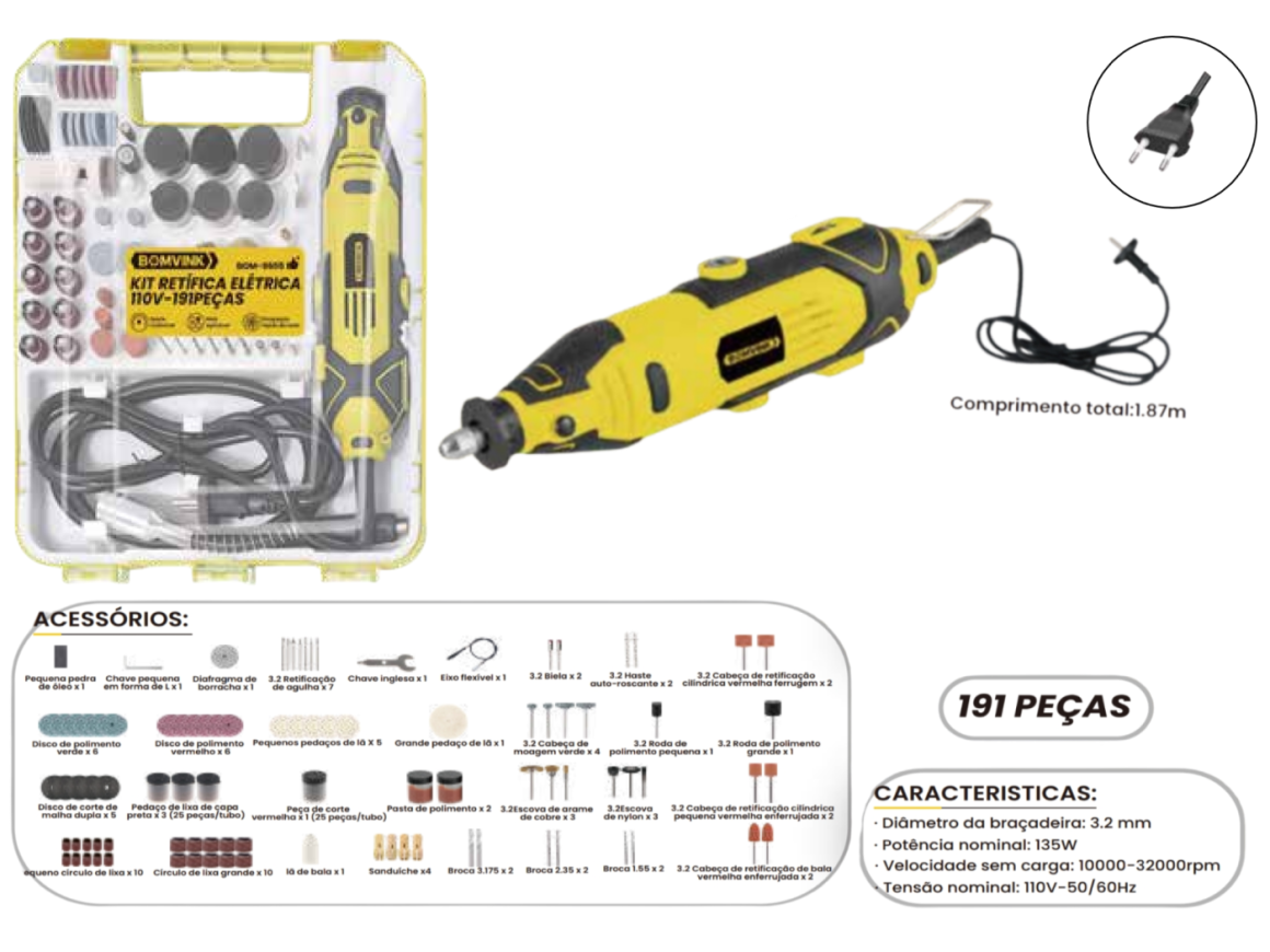 KIT MINI RETIFICA ELETRICA 220V 135W 191 PEÇAS BOM-9606
