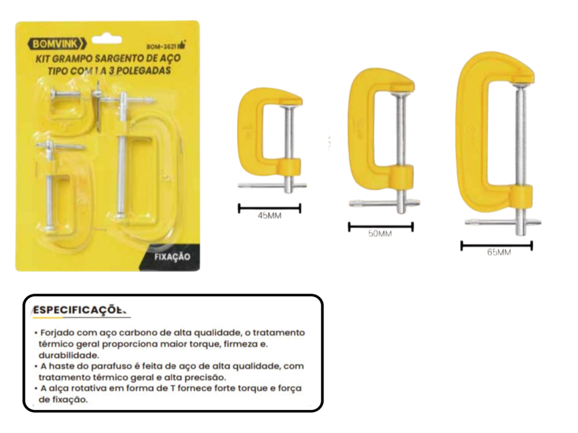 GRAMPO SARGENTO TIPO C COM 3PÇS 1" 2" 3" BOM-3621