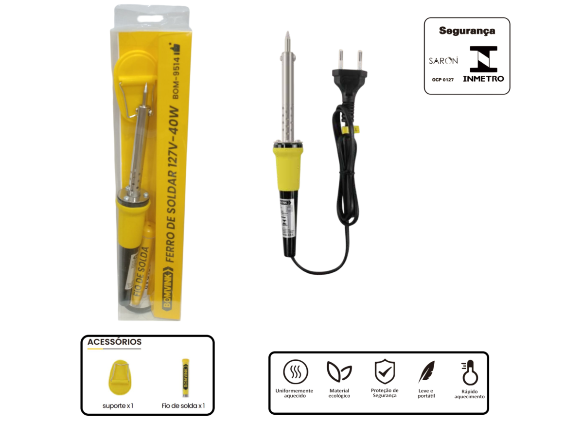 Design ergonômico e de longa durabilidade, possui pegador para os dedos, ou seja, é mais aderente, proporcionando uma pegada mais firme com uma utilização minuciosa e mais detalhada. Possui sistema de dissipação de calor. Disponível em 110v. Acompanha suporte para descanso do ferro e um tubo com rolo de solda.