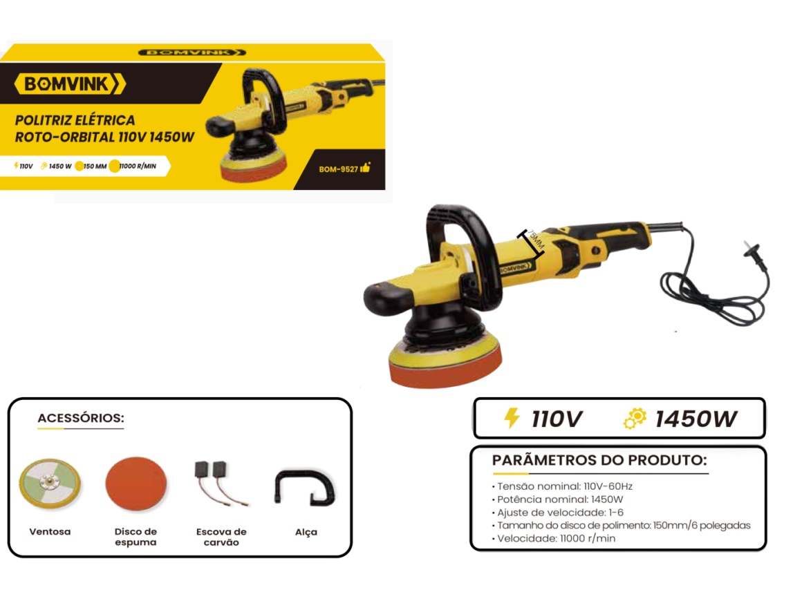 A Máquina de Polir possui um motor potente de 1450W, capaz de atingir até 11.000 rotações por minuto, garantindo eficiência e alta performance no polimento. Funciona em 110V com 50/60Hz, e conta com um disco de 150mm de diâmetro, que é facilmente encaixado por rosca. Com uma alça ergonômica, proporciona conforto durante o uso, permitindo um controle preciso e seguro nas tarefas de polimento.