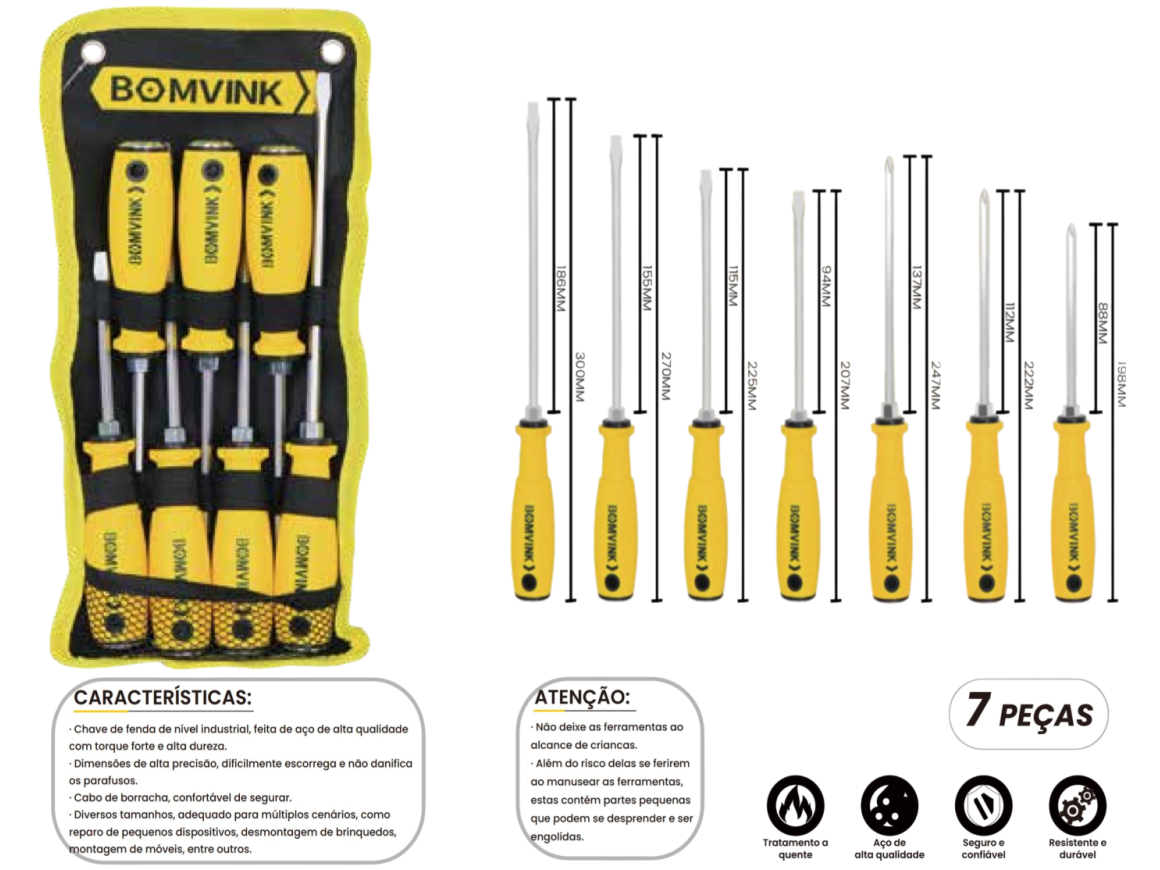 CONJUNTO COM CHAVE DE FENDA E PHILIPS C/ 7 PCS CABO DE IMPACTO BOM-3121