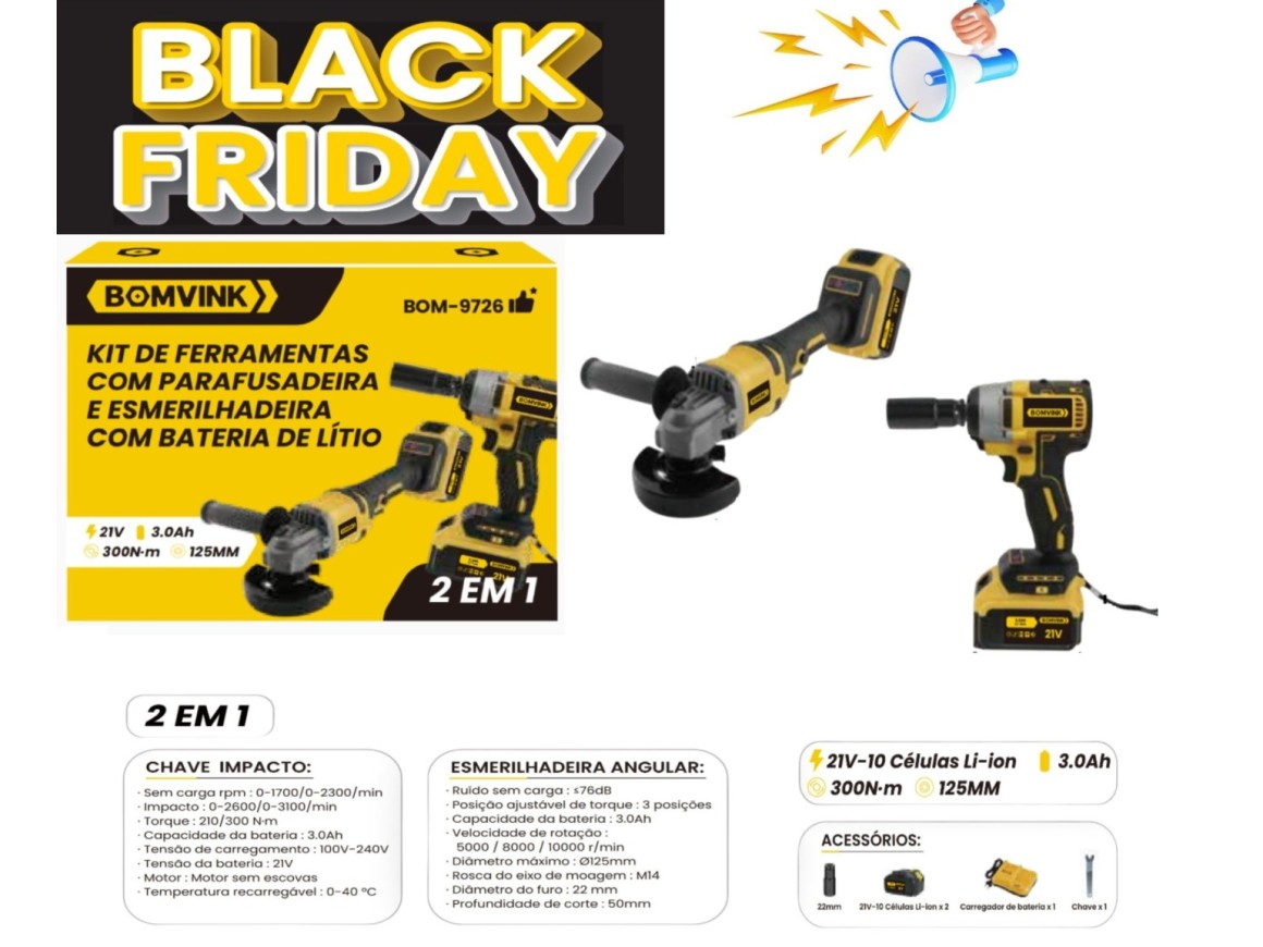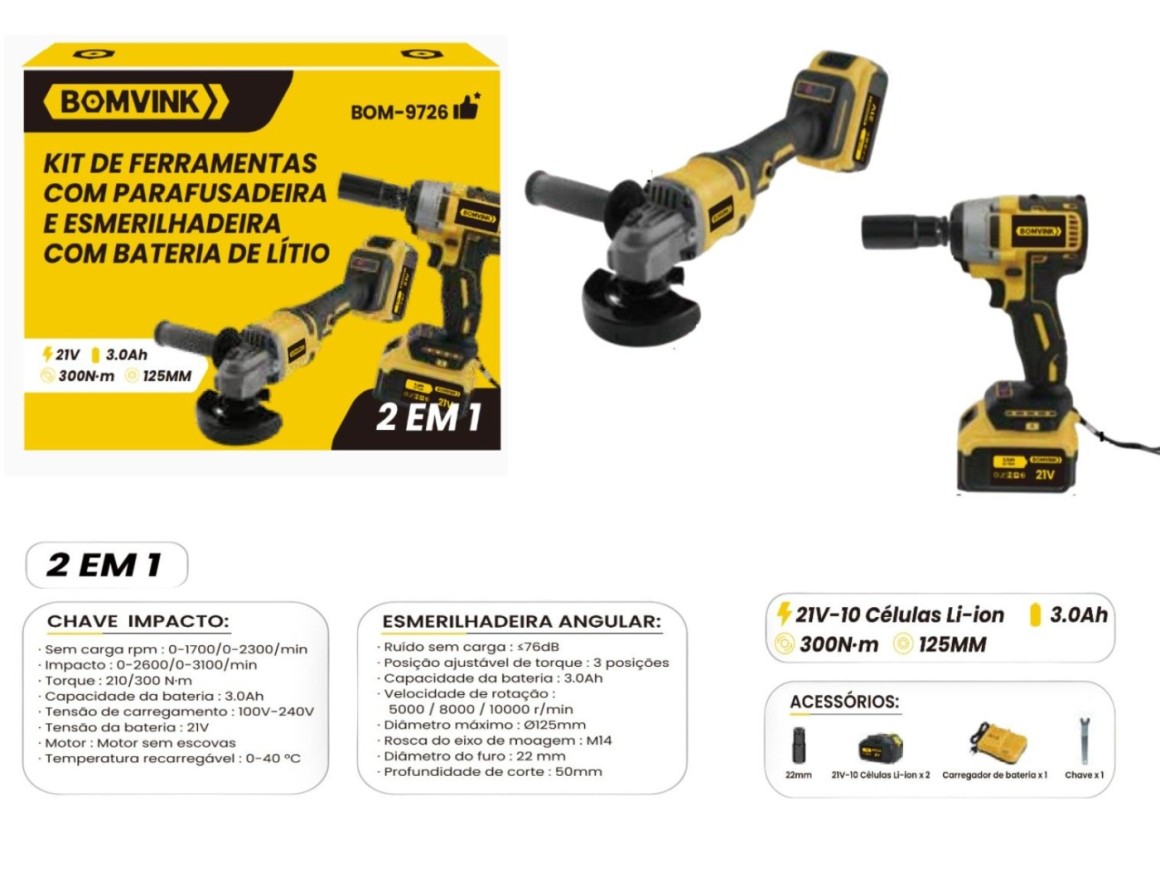 CHAVE DE IMPACTO 300N.M E ESMERILHADEIRA 125MM RECARREGAVEL C/2 BATERIAS 21V BOM-9726