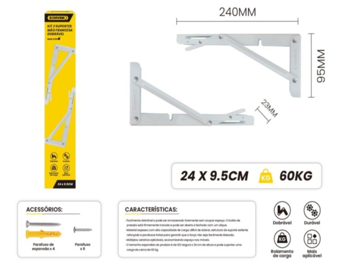 SUPORTE MÃO FRANCESA DOBRAVEL 24 X 9,5 CM C/2 PCS BOM-2741