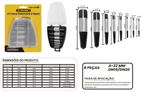 CONJUNTO DE EXTRATOR DE PARAFUSOS C/ 8 PCS 4~22 MM BOM-5205