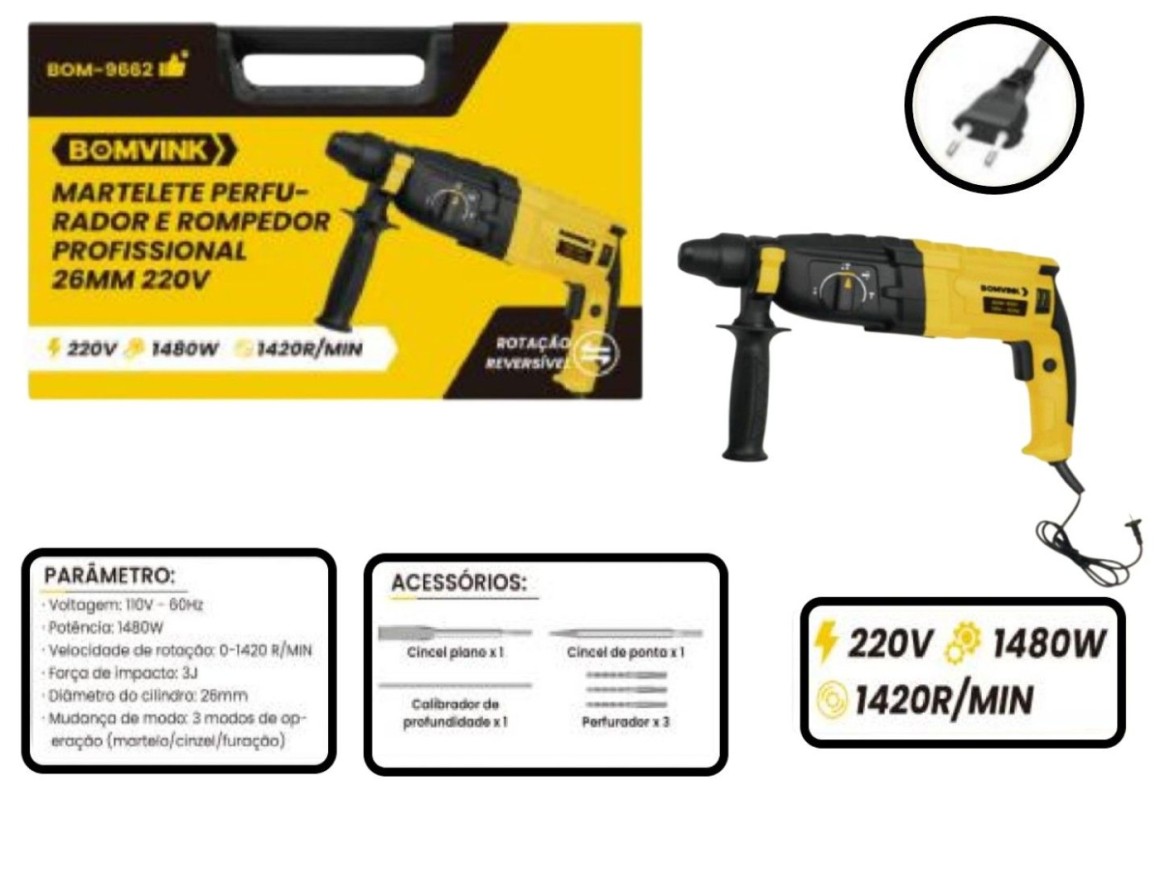 O Martelete Perfurador Bomvink BOM-9662 é a ferramenta ideal para quem busca alto desempenho em perfurações exigentes. Com motor potente de 1480W e energia de impacto de 3 Joules, ele garante eficiência e rapidez mesmo nos trabalhos mais pesados. Projetado para profissionais como instaladores, eletricistas, encanadores e também para o uso doméstico, ele oferece versatilidade e força em qualquer aplicação.