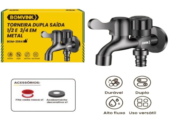 TORNEIRA DUPLA DE METAL PRETA P/ MAQUINA DE LAVAR1/2" BOM-2064