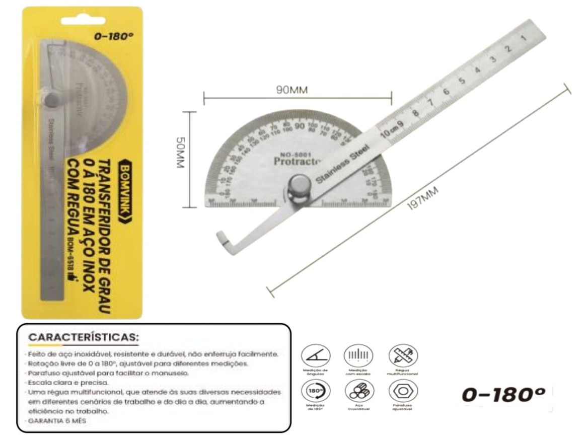 ESQUADRO TRANSFERIDOR DE GRAUS DE 0 A 180 DE AÇO INOX BOM 6518
