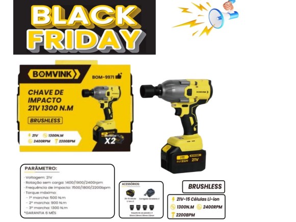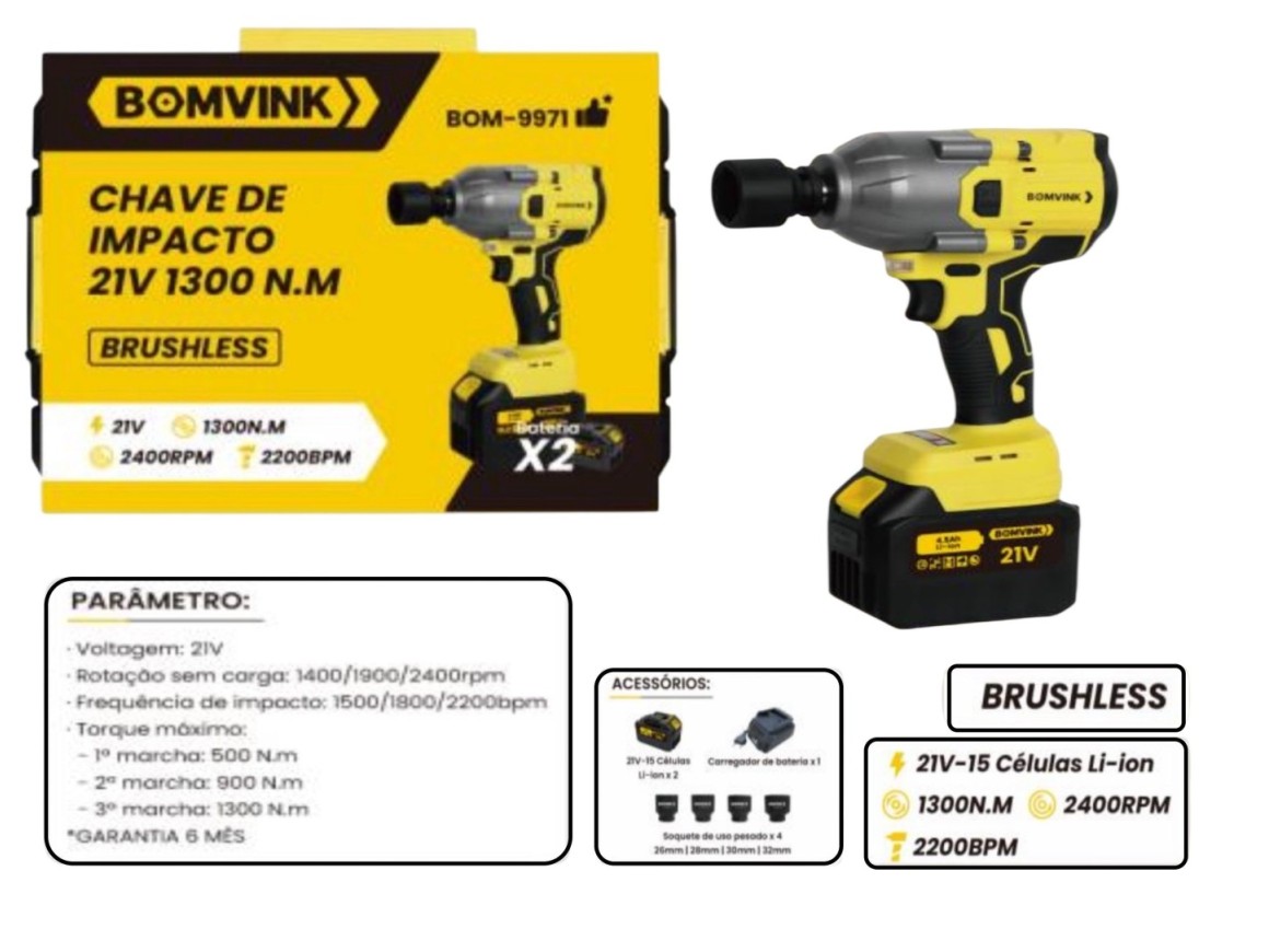 Cansado de ferramentas que não dão conta do trabalho pesado? CHEGOU A SOLUÇÃO DEFINITIVA! A Chave de Impacto Elétrica BOM-9971 da Bomvink foi desenvolvida para SUPERAR TODOS OS DESAFIOS com seu IMPRESSIONANTE TORQUE DE 1300NM - potência suficiente para remover até mesmo as porcas mais resistentes de rodas de carros e camionetes!