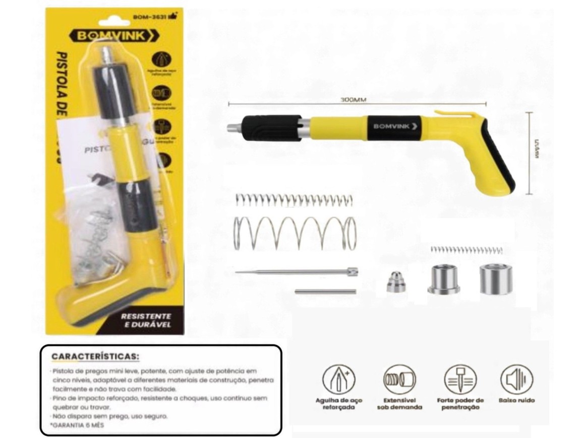 Com dimensões de 33 cm de comprimento, 6 cm de largura e 11 cm de altura, esta pistola é compacta e fácil de manusear, ideal para espaços reduzidos. O modelo é projetado para utilizar pinos de aço, garantindo uma fixação robusta e duradoura em diversos materiais, como madeira e MDF, ETC.