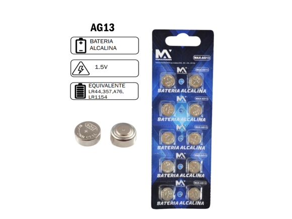 BATERIA ALCALINA AG13 LR44 C/10 UN. 1,5V MAX-AG13